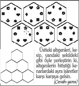 Üstteki altıgenleri, kesip, yandaki şekildeki gibi öyle yerleştirin ki, altıgenlerin bitiştiği kenarlardaki aynı işâretler karşı karşıya gelsin.