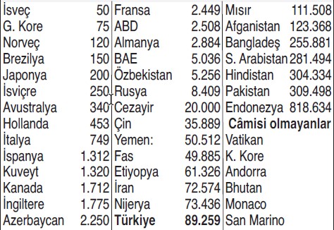 DÜNYA.............. BAZI DEVLETLERDE CÂMİ SAYILARI