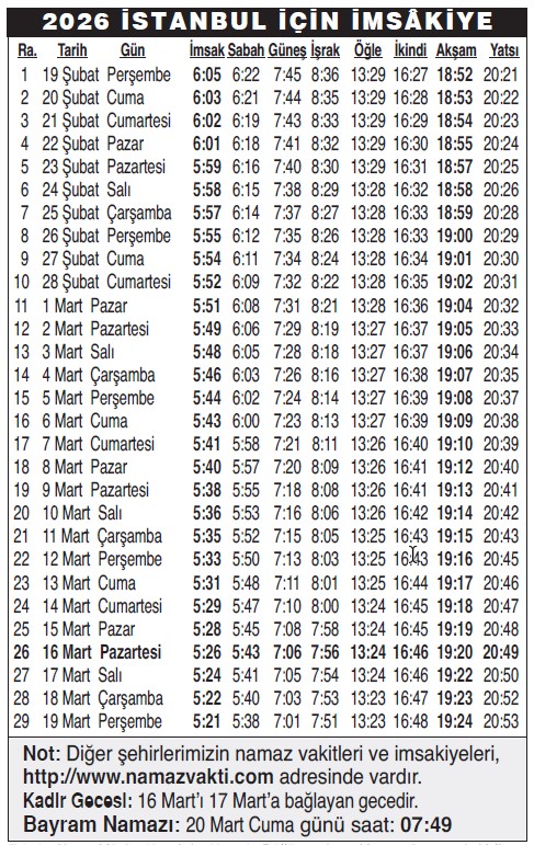 2026 İSTANBUL İÇİN İMSÂKİYE Erkek: Ahmet Münir - Kız: Aslı - Yemek: Düğün çorbası, Yumurtalı ıspanak, Yoğurt. « Önceki Gün Bugün Sonraki Gün » Tarih Ön Yüz