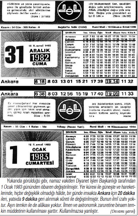 YANLIŞ OLAN, 1983 VE SONRASI NAMAZ VAKİTLERİNİN AÇIKLAMASI