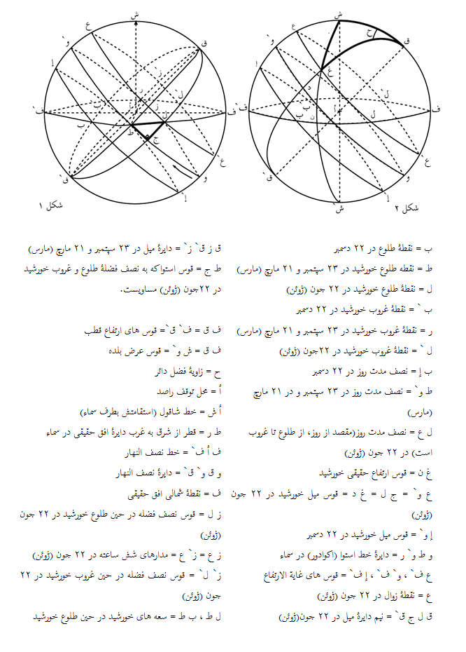 به مستوی هاييکه از شاقول يک محل میگذرد، (مستوی های سمت) گويند. اگر فرض کنيم که مستوی های سمت، کره سماء را قطع می کند، به اين دايره هايی که در سطح کره بوجود می آید، (دايره سمت [AZIMUT]) های آن محل ويا (دايره های ارتفاع) آن محل ميگويند. دايره های سمت يک محل، افق های اين محل را بطور عمودی قطع ميکند. از يک محل کره زمين، به تعداد زيادی مستوی های سمت و تنها يک مستوی ميل ميگذرد. محور زمين و شاقول يک محل، در مرکز زمين يکديگر را قطع ميکنند. مستوی ايکه از اين دو خط مستقيم ميگذرد، هم مستوی سمت و هم مستوی ميل این محل ميباشد. به اين مستوی، مستوی (نصف النهار) اين محل ميگويند. به دايره ای که مستوی نصف النهار، کره سماء را قطع ميکند، (دايره نصف النهار) آن محل گويند. سطح نصف النهار، سطح افق حقيقی آن محل را بطور عمودی قطع کرده دايره افق حقيقی را به دو قسمت مساوی تقسيم ميکند. به خط مستقيمی که سطح افق حقيقی را قطع ميکند، (خط نصف النهار) آن محل گويند. دایره سمت، از مرکز خورشيد [از نقطه غ] گذشته افق حقيقی آن محل را در نقطه (ع) در سماء قطع ميکند. به قطعه قوس (غ ع) که ميان نقطه (ع) در سماء و مرکز خورشيد [نقطه غ] قرار دارد (قوس ارتفاع حقيقی) گويند. درجه اين قوس، (ارتفاع حقيقی) خورشيد در آن محل و در آن لحظه ميباشد. خورشيد، هر لحظه، از دايره های سمت ديگری ميگذرد. دايره سمتی که از يک کناره (ز) خورشيد ميگذرد، در يک نقطه اين کناره را و در نقطه ديگر مستويهای افق حقيقی، رياضی، مرئی و حسی را قطع ميکند. در ميان اين دو نقطه قطع در سماء، قوسهايی حاصل ميگردد که به اين قوسها (قوس ارتفاع ظاهری) نظربه اين افق ها گويند. به درجه اين قوس ها، (ارتفاع های ظاهری) خورشيد نظربه اين افق ها گويند. ارتفاع سطحی آن، از ارتفاع حقيقی اش بيشتر است. در هنگاميکه خورشيد ازين افقها در ارتفاع يکسان قرار دارد، نظربه هر افق، اوقات متفاوت ظاهر ميگردد. ارتفاع حقيقی، درجه زاويه حاصل شده توسط دو نيم خطی است که از مرکز زمين بيرون آمده از دو سر قوس ارتفاع حقيقی ميگذرد. درجه قوسهاييکه موازی به اين قوس (قوس ارتفاع حقيقی) در سماء بوده، به تعداد بيشمار و در طولهای (درازيهای) مختلف در ميان اين دو نيم خط قرار دارند، به يکديگر مساوی بوده، همه شان به اندازه درجه ارتفاع حقيقی ميباشد. دو نيم خطيکه، زاويه هاييرا که مساوی به ارتفاعهای ديگر است حاصل ميکند، از نقطه قطع شاقولی برميآيد که، این شاقول، از محل توقف راصد گذشته، افق را قطع مينمايد. یعنی این دو خط مستقیم، همیشه در محل توقف راصد، یکدیگر را قطع می نماید. درجات اين زوايای ارتفاع نيز، به اندازه درجات قوس هايی است که در داخل شان وجود دارد. به مستوی نامتناهی ايکه که از مرکز زمين ميگذرد و به محورش عمود ميباشد (مُعَدِّل النّهار= مستوی اکوادور) گويند. به دايره ای که این سطح اکوادور، کرهٔ ارض را قطع می کند (دايرهٔ مُعَدِّل النّهار= اکوادور = خط استوا) گويند. استقامت و محل سطح اکوادور و دايره اکوادور ثابت ميباشد، هيچ تغيير نميکند. هر دو نيز، کره زمين را، به دو نيم کره مساوی تقسيم می کنند. به درجه قوس دايرهٔ ميليکه بين مرکز خورشيد و سطح اکوادور ميماند (ميل خورشيد) گويند. قبل از طلوع ظاهری، سفيدی بالای خط افق ظاهری، به اندازهٔ دو درجهٔ ارتفاع قبل از سرخی شروع ميشود. يعنی، هنگاميکه خورشيد ۱۹ درجه به خط افق ظاهری نزديک شود، (سفيدی) شروع ميشود. فتویٰ اينگونه است. کسانی که مجتهد نيستند، حق ندارند که اين فتویٰ را تغيير بدهند. در ابن عابدين و تقويم م. عارف بگ نوشته شده است که، اينگونه خبر نيز نقل گرديده است که در هنگامی که خورشيد به افق ظاهری ۲۰ درجه نزديک شود، (سفيدی) شروع ميگردد. امّا، عباداتی که به فتویٰ مطابق نميباشد، صحيح نميشود.