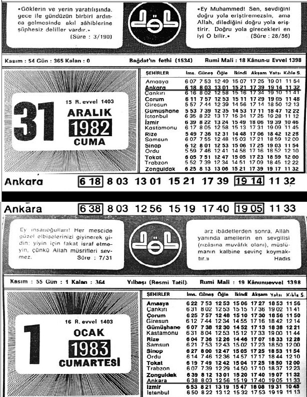 1 Ocak 1983 gününden itibaren değiştirilmiştir. Yer küresi ile güneşte ve hareketlerinde, hiçbir değişiklik olmadığı hâlde, bir günde imsakta Ankara için 20 dakika ileri, yatsıda 9 dakika geri alınmak sureti ile değiştirilmiştir. Bunun ilmî izahı yoktur. Aşırı temkin ile de alâkası yoktur. İlmen ve astronomik zaruretine binaen temkin müddetinin kullanılması şarttır. Kullanılmazsa yanlıştır. (Devamı yarın)