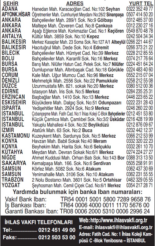 İHLAS VAKFI YURTLARININ İLETİŞİM BİLGİLERİ